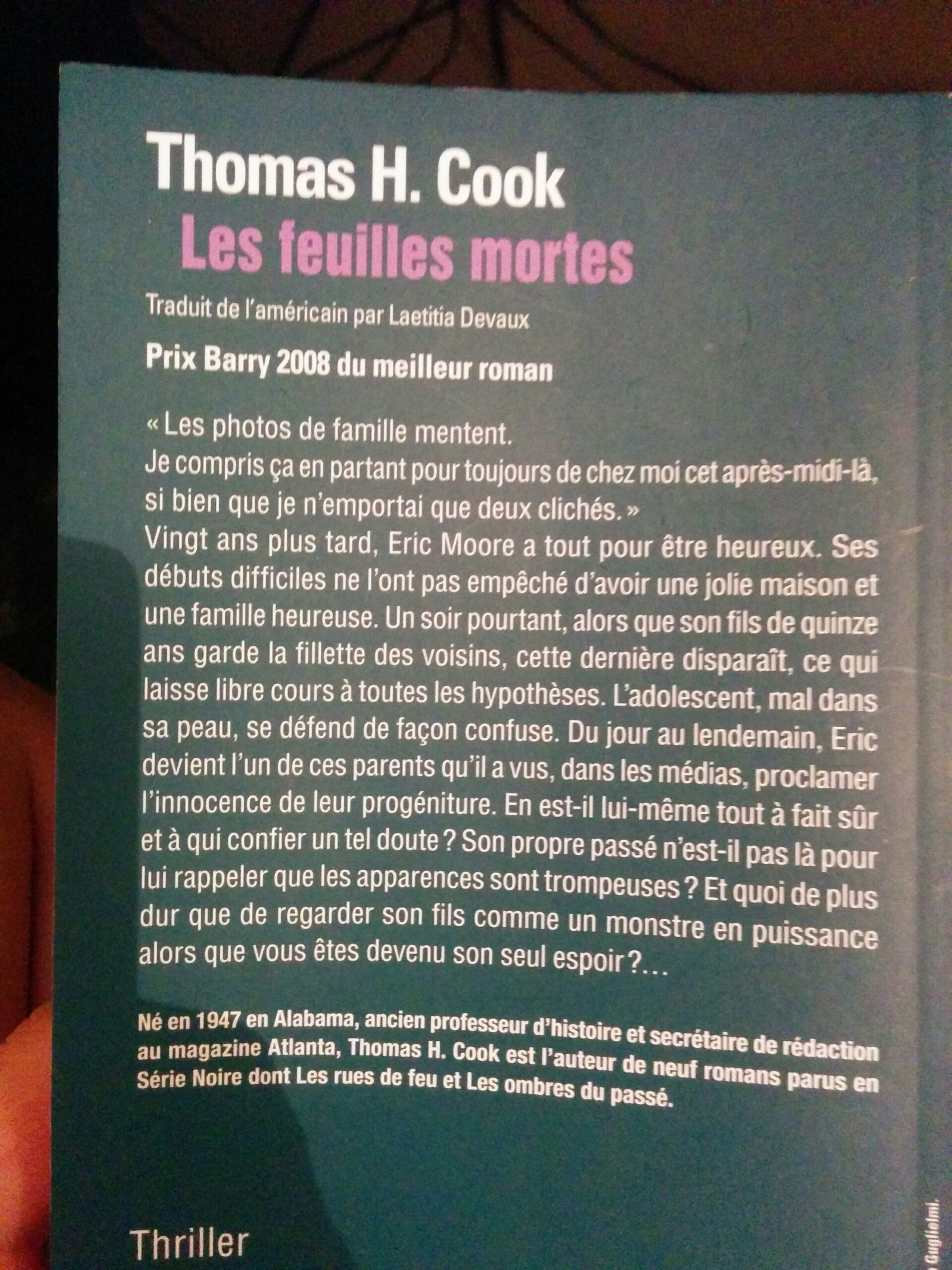 Voilà que je ferme juste le thriller de Thomas H. Cook, les feuilles mortes. Un livre court mais qui ne se lit pas des plus simplement. L’auteur nous traîne dans une sorte d’introspection de son protagoniste.